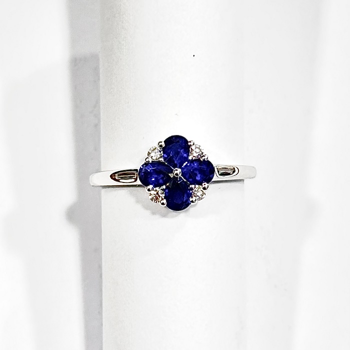 18ct white gold four pear cut sapphire and four round brilliant cut diamond flower style ring