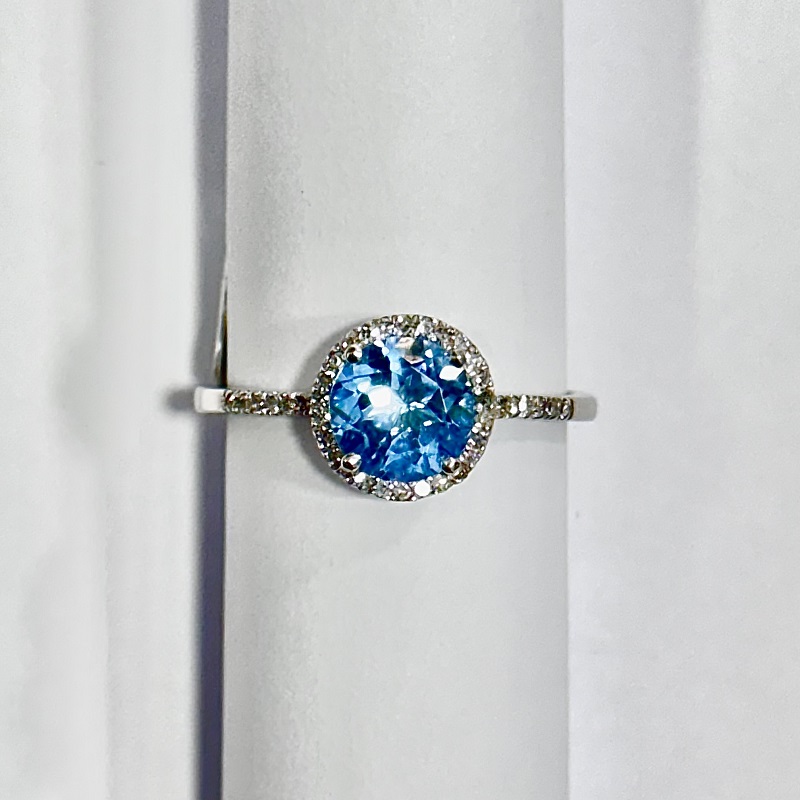 9ct white gold blue topaz and diamond halo ring with diamond set shoulders