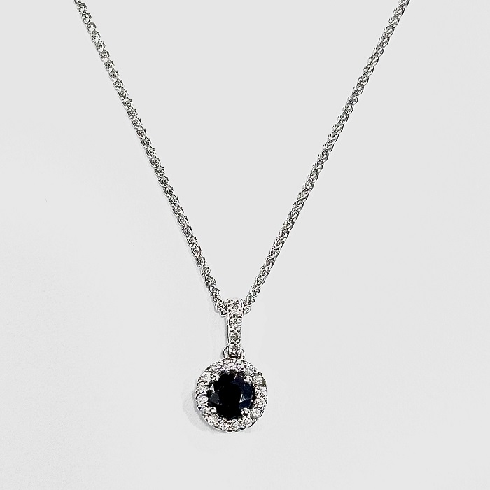 9ct white gold round brilliant cut sapphire and diamond halo pendant
