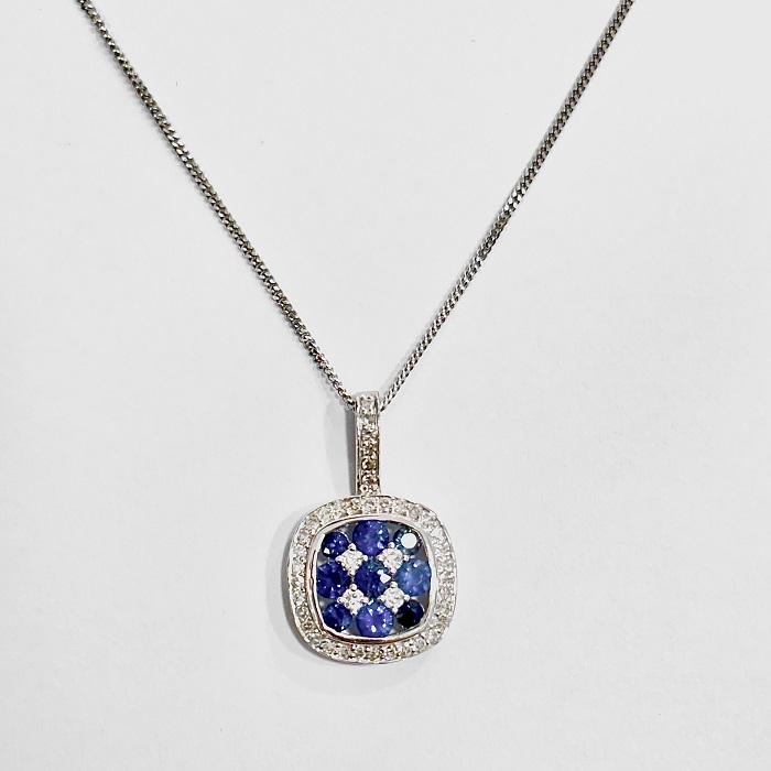 9ct white gold sapphire and diamond fancy square cluster pendant