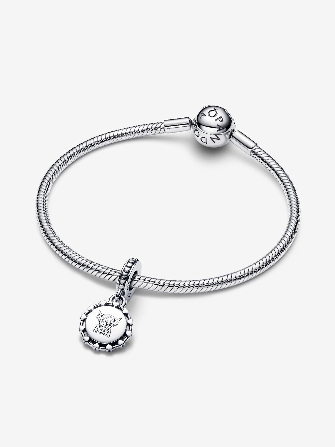Bring a piece of the Highlands home with our Engravable Scottish Cow Dangle Charm. Crafted in sterling silver, one side features the iconic Scottish cow. The other side is engravable for your personal message.