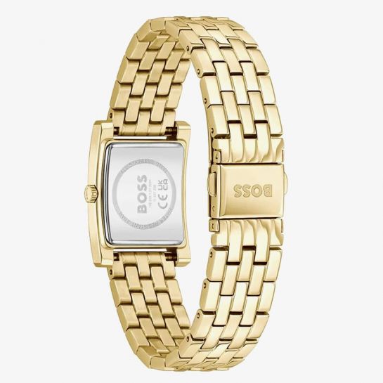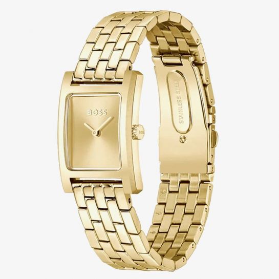 The BOSS ladies Lucy Watch is crafted with meticulous attention to detail, this watch is a celebration of sophistication and refinement. The luxurious gold-plated finish adorns the rectangular case, adding a touch of opulence to its design, perfect for everyday wear.