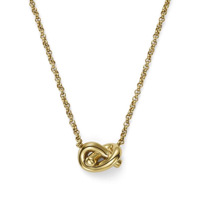 This special interpretation of the iconic love knot is simple, elegant and meaningful. Representing shared love and unity, this delicate gold-plated pendant necklace has a sculpted metal finish and smooth curves. Paired with a dainty chain, this timeless piece makes a beautiful gift or self-love treat.