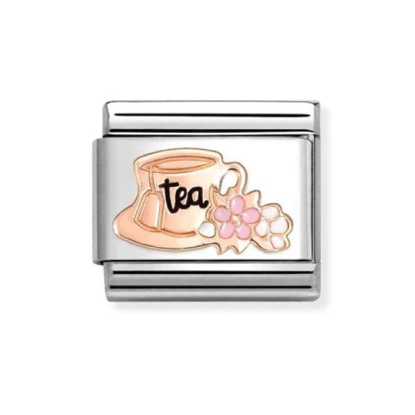 Original Nomination Classic Link in stainless steel with TEA Cup symbol in bonded rose gold with flowers with details in Black, Pink and White enamel. A time-honoured and daily tradition for millions around the world is captured on this beautiful Link.
