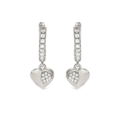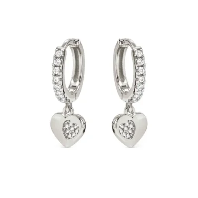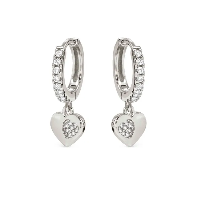 Sterling silver hoop earrings with Heart pendant and Cubic Zirconia, White Rhodium treated finish. Show who you are and what you love with these sparkling earrings that are both refined and eye-catching!