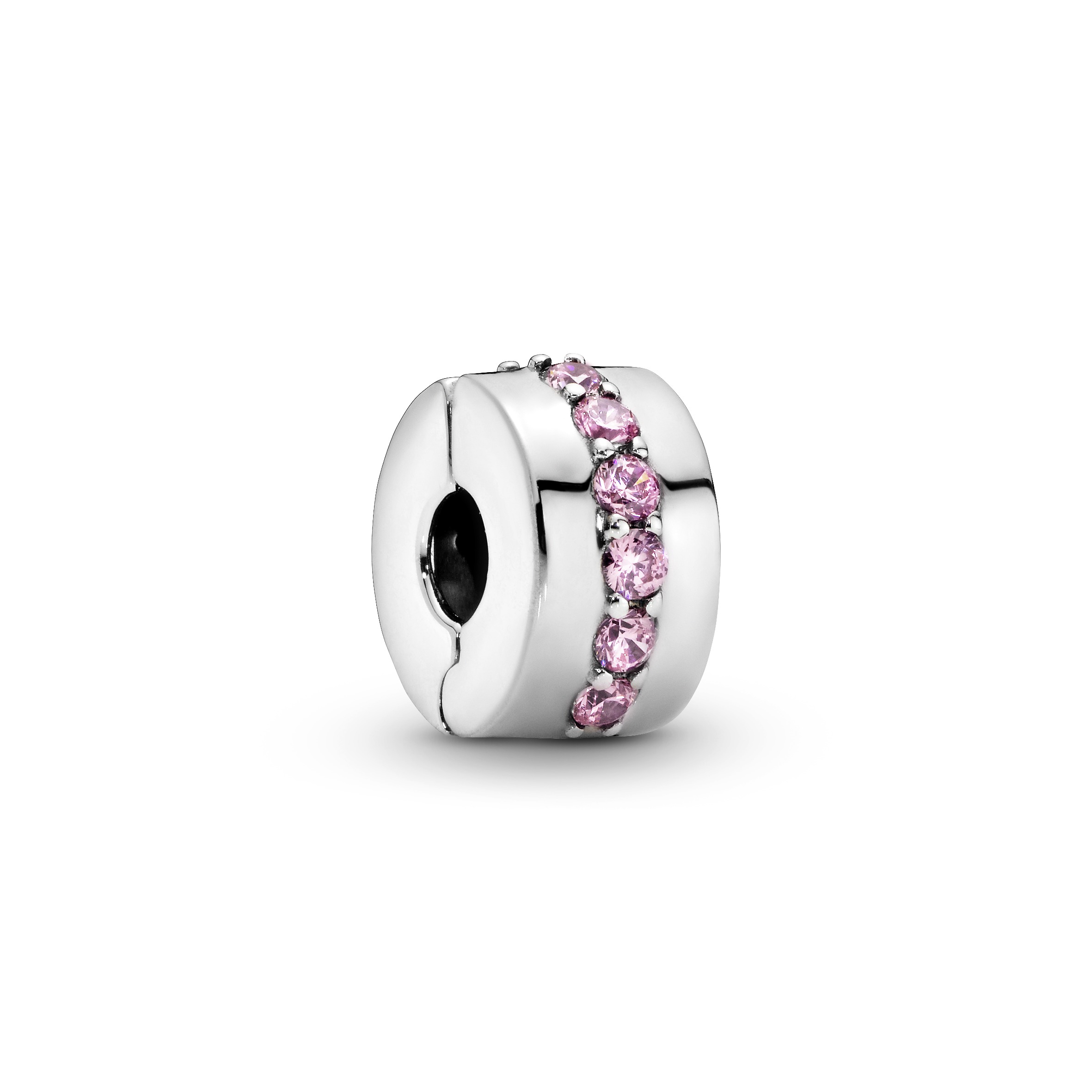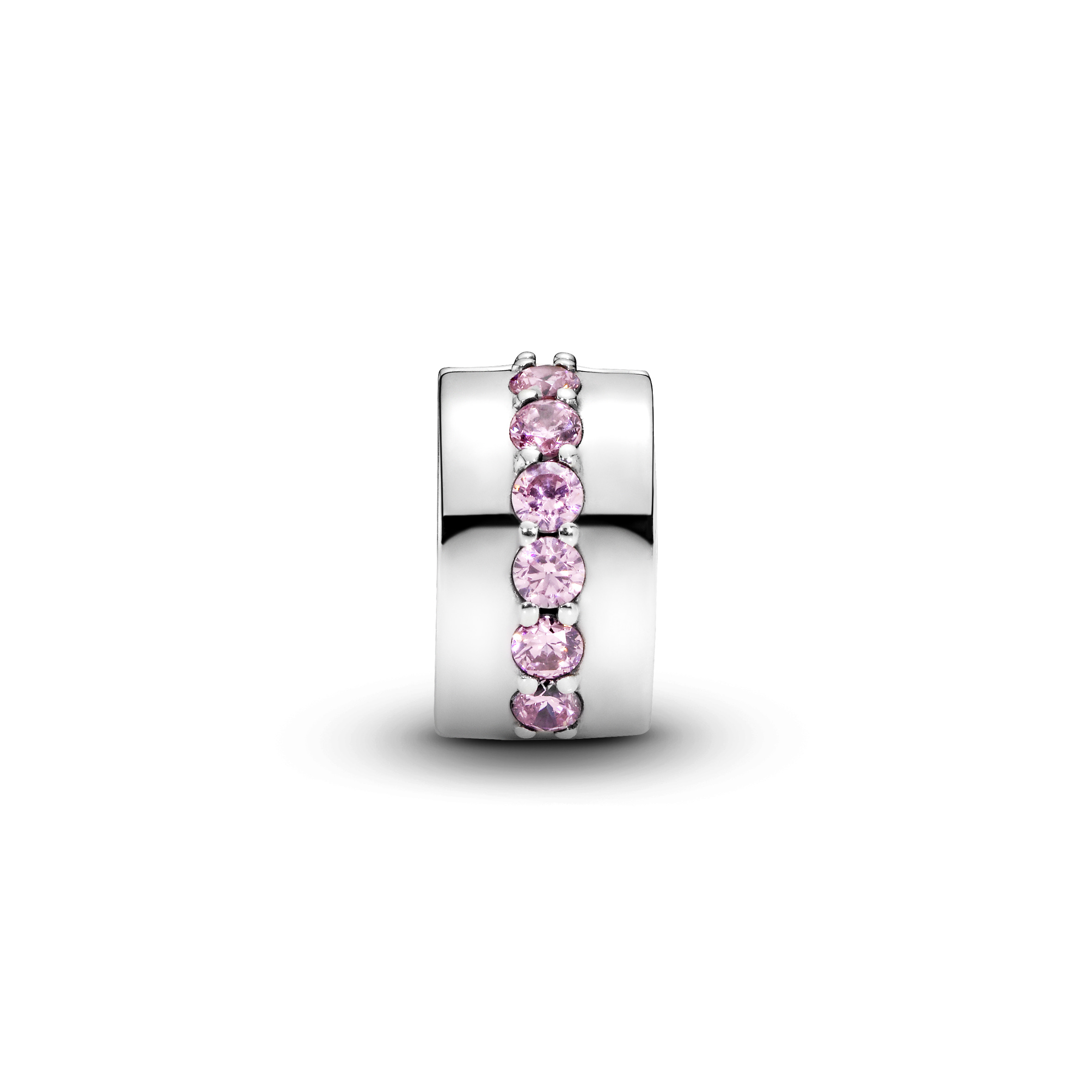 Keep your charms secure and in place with this beautiful Pandora clip. Crafted from sterling silver, featuring a row of eye catching pink cubic zirconia set down the centre creating a stylish and sparkling effect.