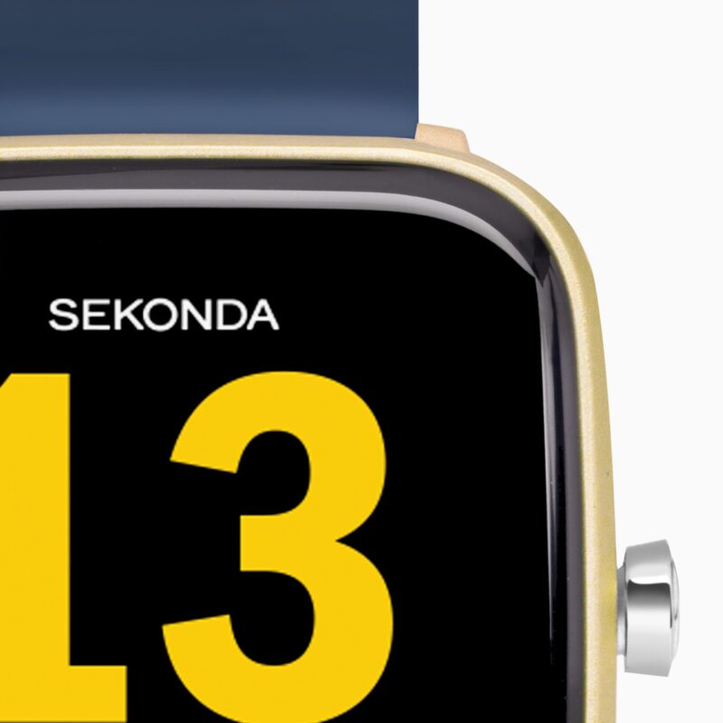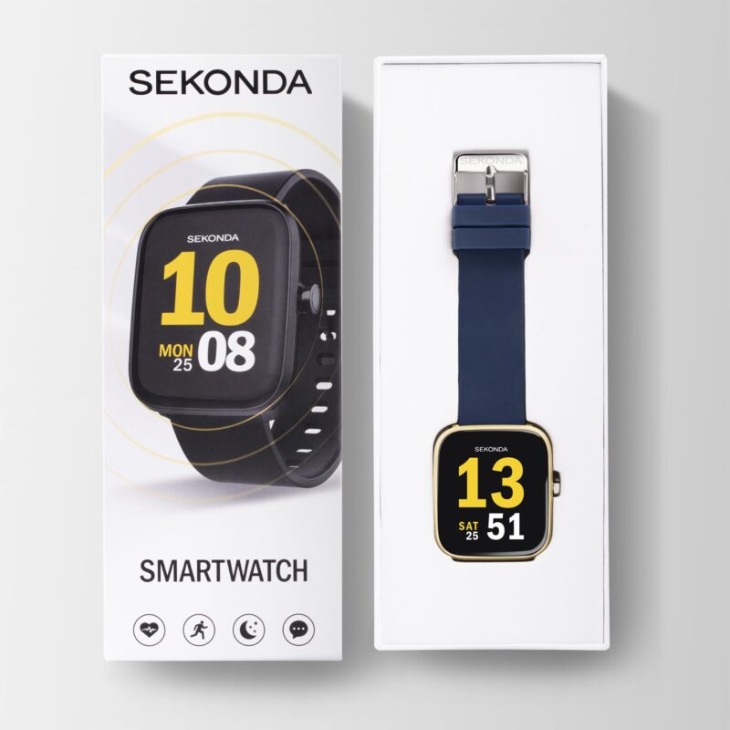 Everyday Smart. Everyday Style. Sekonda’s Motion smart watch has a gold plastic case with a fully interactive, 1.4 inch LCD screen dial and is fastened with a 20mm blue silicone strap. Features include steps/calorie/distance tracker, sleep monitor, push notifications for messages, 5 sports modes and long battery life, up to 10 days depending on use! The watch has a water resistance rating of IP68. This means that the watch is splashproof and showerproof but not recommended for swimming or watersports. Smart Watch. Smart choice.
