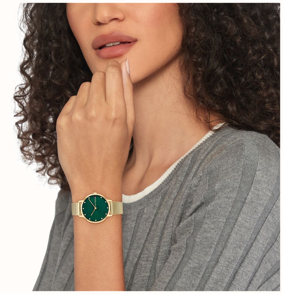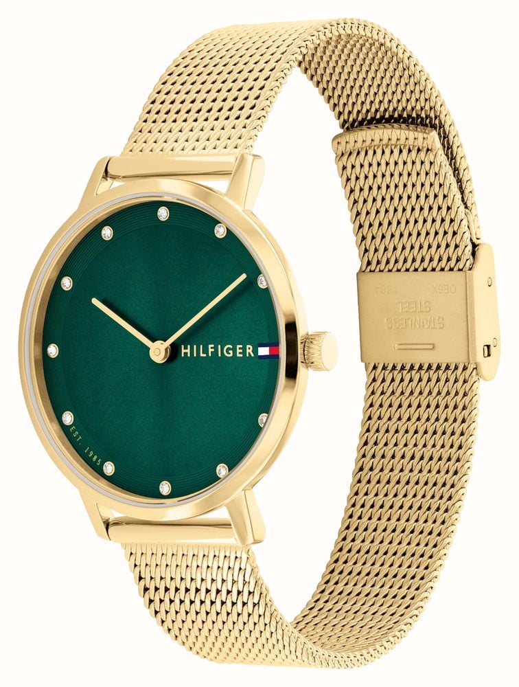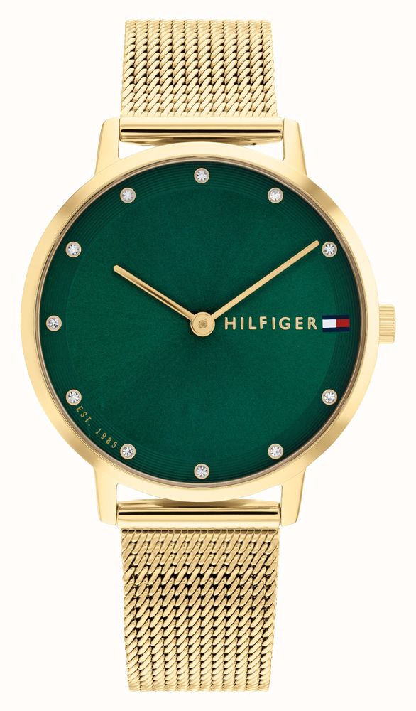 Tommy Hilfiger 1782668 ladies watch from the Pippa collection. Featuring a round polished gold plated stainless steel case, with a green colour sunray dial, and crystal detail. This watch is fitted with a gold plated stainless steel mesh bracelet, that has a snap fasten. A beautiful and trendy designer watch.